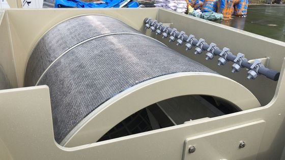 The polluted water enter the TPA through the water inlet pipes. Flows into boxes and then into the interior of the filtering drum.The filtering drum is covered with a micro mesh filter. The polluted water can only leave the drum by passing the filter mesh, all particles bigger than the filter mesh will stay inside the drum filter.
